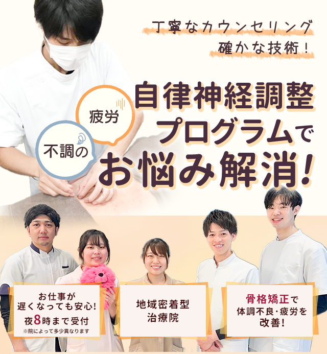 カイロプラクティックをベースにした骨格調整を行い、筋肉を本来の位置に戻るように整えていきます。また自律神経調整プログラムでは鍼灸を使用し自律神経を調整していきます。