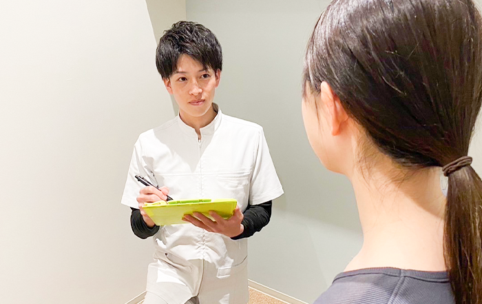 痛みや悩みの状況、日常生活、お仕事内容、施術方法へのご希望、悩みが緩和された時の理想を伺います。