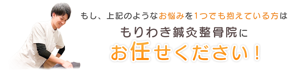 大阪にある整骨院「もりわき鍼灸・整骨院・整体院グループ」では、厚生労働省認可国家資格を有するスタッフがもりわき式美整骨(特許庁認可)やカイロプラクティック、また鍼や灸を用いた施術を行い、患者様それぞれの症状に合った方法で根本的な解消へと導いていきます。