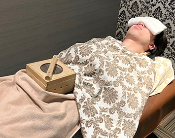 ②温熱灸(升灸を腹部、足元に遠赤外線、頚部にホットタオル)による自律神経調整